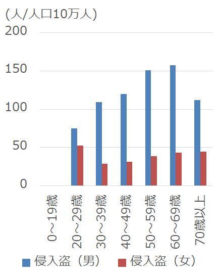 侵入盗では、男性の60歳代の157.29人が最も多く、次いで男性の50歳代の150.97人となっています。女性は、20歳代の52.35人が最も多くなっています。