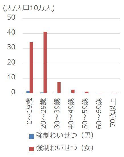 一方、女性の被害者が多い犯罪の方では、強制わいせつは女性の20歳代が最も多く、41.21人となっています。公然わいせつでは、19歳以下の女性が最も多く、4.53人となっています。