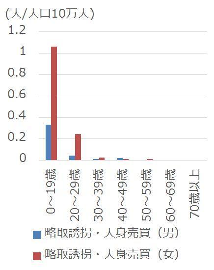 略取誘拐・人身売買も女性被害者が多くなっています。最も多いのは19歳以下の女性の1.06人です。しかし、それに次ぐのは19歳以下の男性の0.33人、20歳代の女性0.24人と、略取誘拐・人身売買については男女問わず、若年層の被害が多いことが分かります。